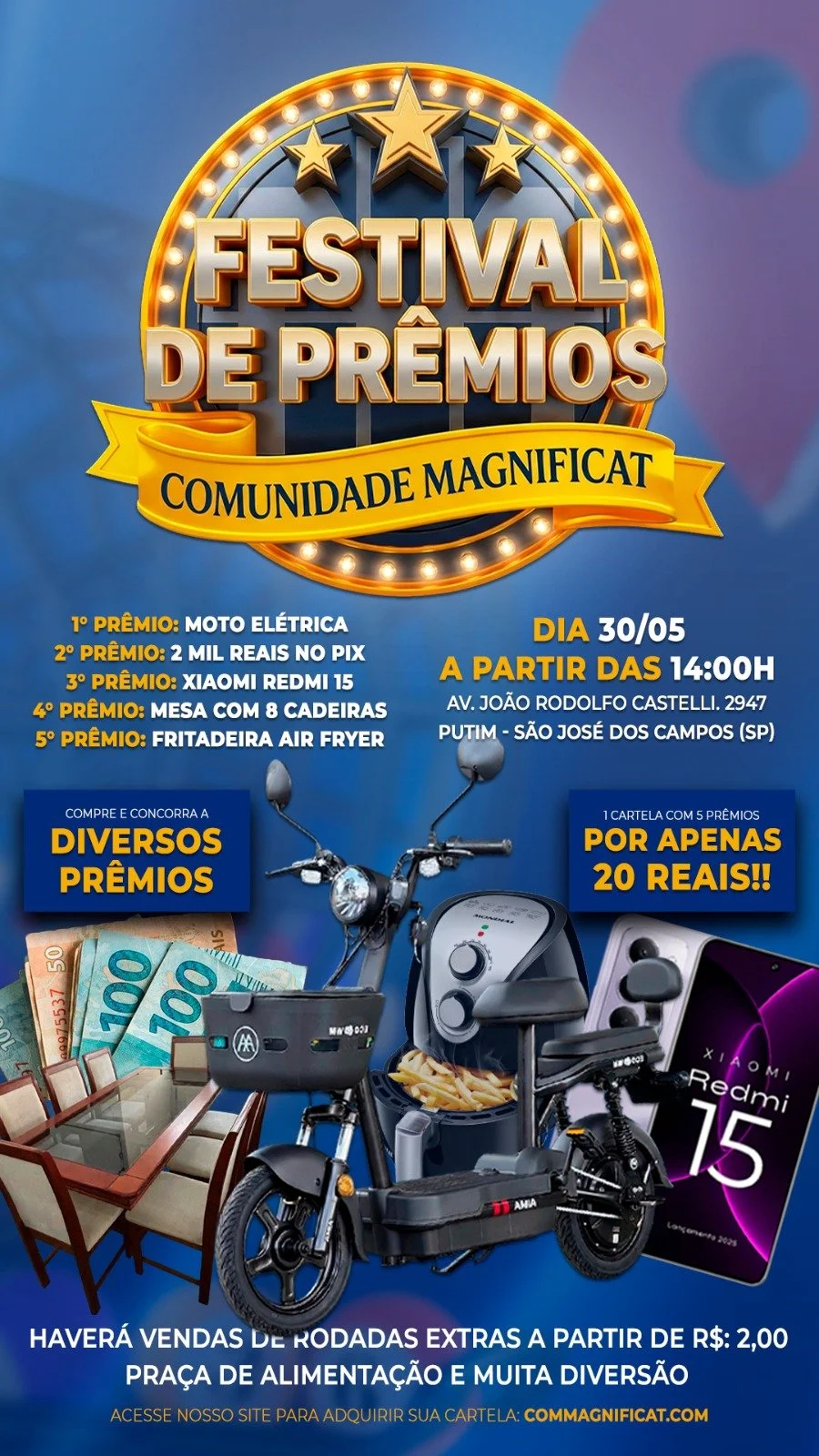 A Comunidade Magnificat convida você e sua família para uma tarde de muita alegria, comunhão e a chance de levar prêmios incríveis para casa! O nosso Festival de Prêmios já tem data marcada e você não pode ficar de fora.
